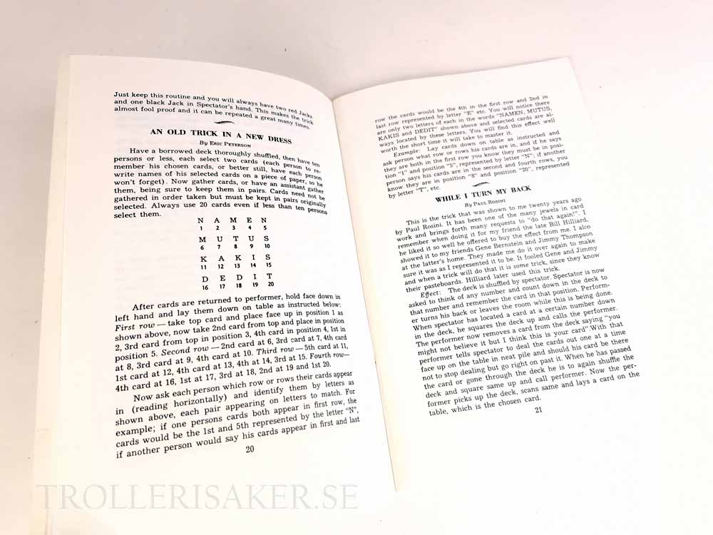 By W. F. “Rufus” Steele. 50 classic card tricks that, even though they require no sleight of hand, are more mystifying than sleight of hand tricks. Outstanding items are: Ralph Hull’s famous Joker Spelling Trick and also his Brain Teaser, Steele’s Poker Run Up, personal stack, and Harry Miller’s Whispering Queen.