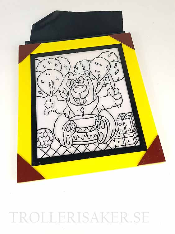 Nu täcker du över tavlan en stund och när barnen åter ser tavlan så är det en tecknad björn på bilden.