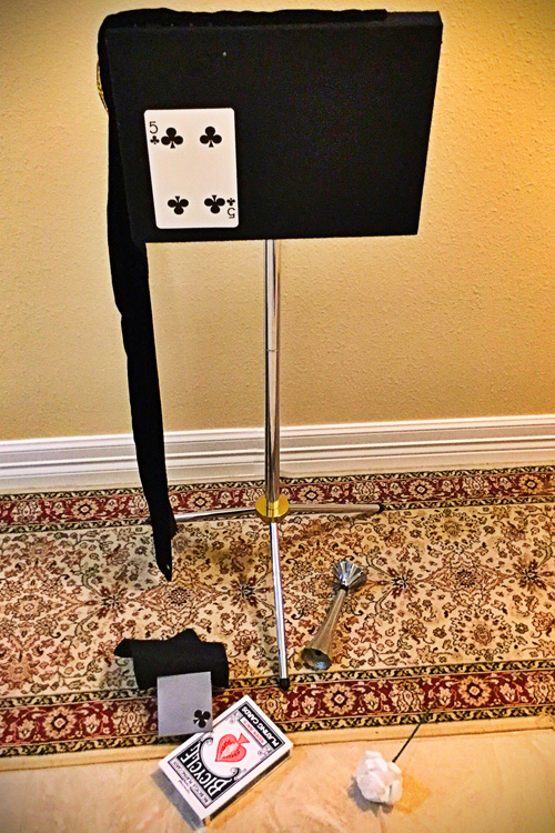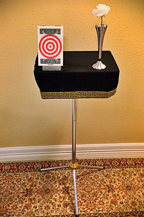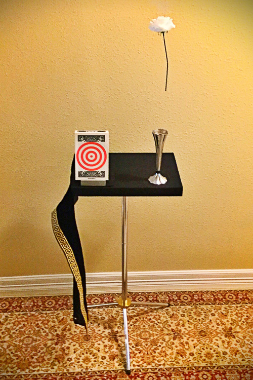 Using a pistol, the spectator attempts to shoot the chosen card out of the deck…. But … BANG! the table drape falls off … BANG! .. the flower flies into the air … BANG! .. the entire table tips, dumping everything onto the floor, except a jumbo five of clubs, which adheres to the table…… “It’s not my card...,” says the spectator.