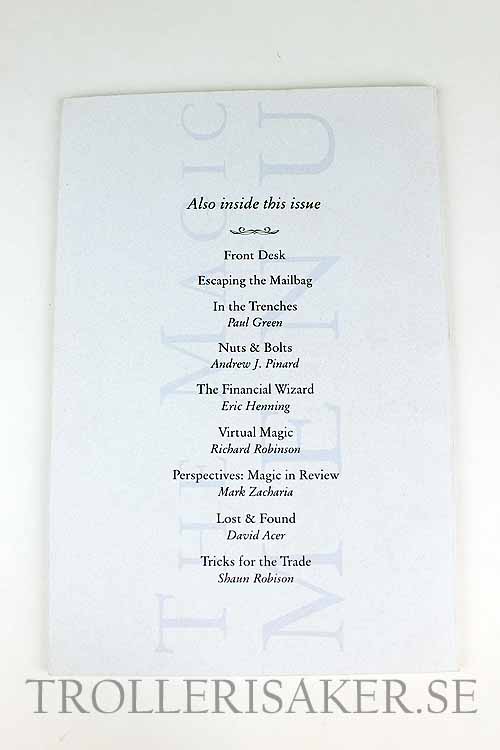 Each quarterly issue is packed with information for the working performer, with helpful articles, honest and concise reviews and, of course, original magic from established professionals and unknown pioneers making their mark.