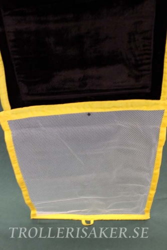 A rectangular piece of see-thru netting hangs in front of it. Simply fold the netting in half to form a cradle, give it a shake, and instantly the net is full of silks, flowers, or whatever you'd like to produce.