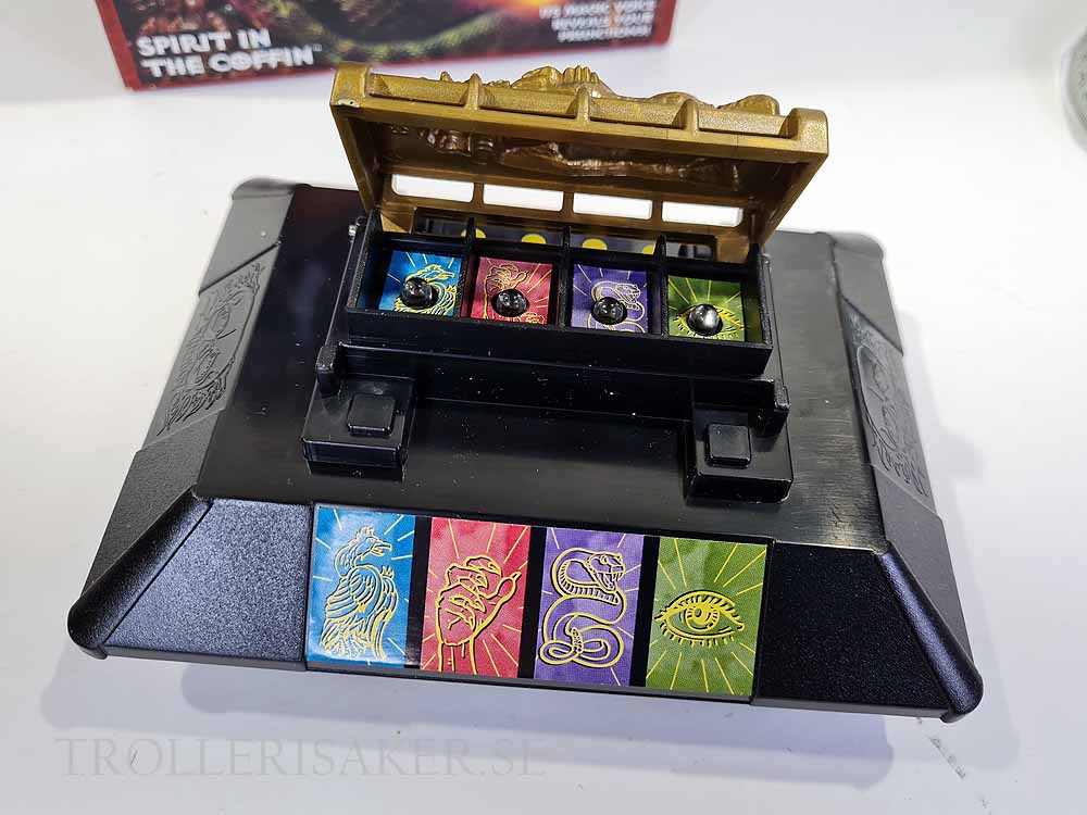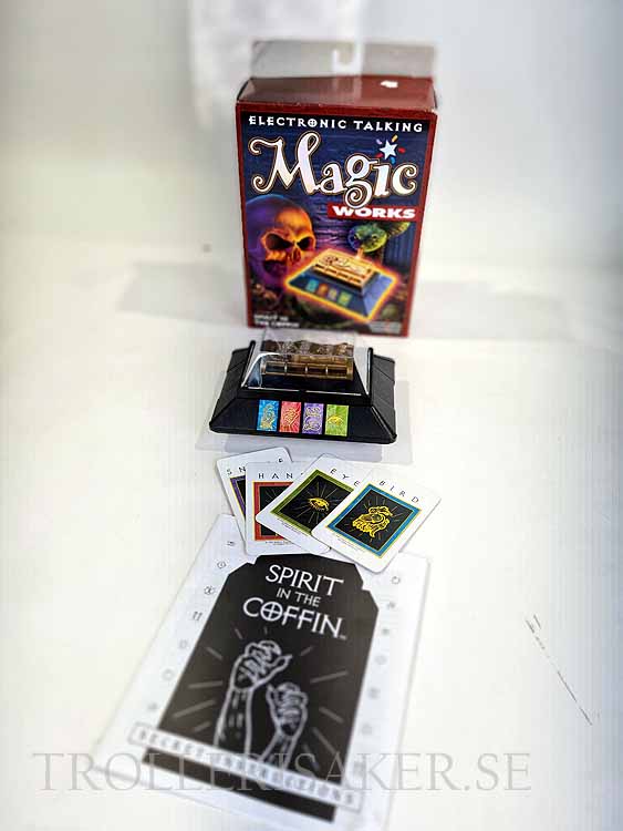 Spirit in the Coffin includes: Electronic coffin unit, four symbol cards, fully illustrated easy-to-follow instructions with special performance hints.
