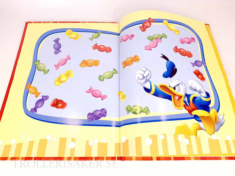 Du visar en bok med bilder på Disneyfigurer som omger sig med olika karameller.